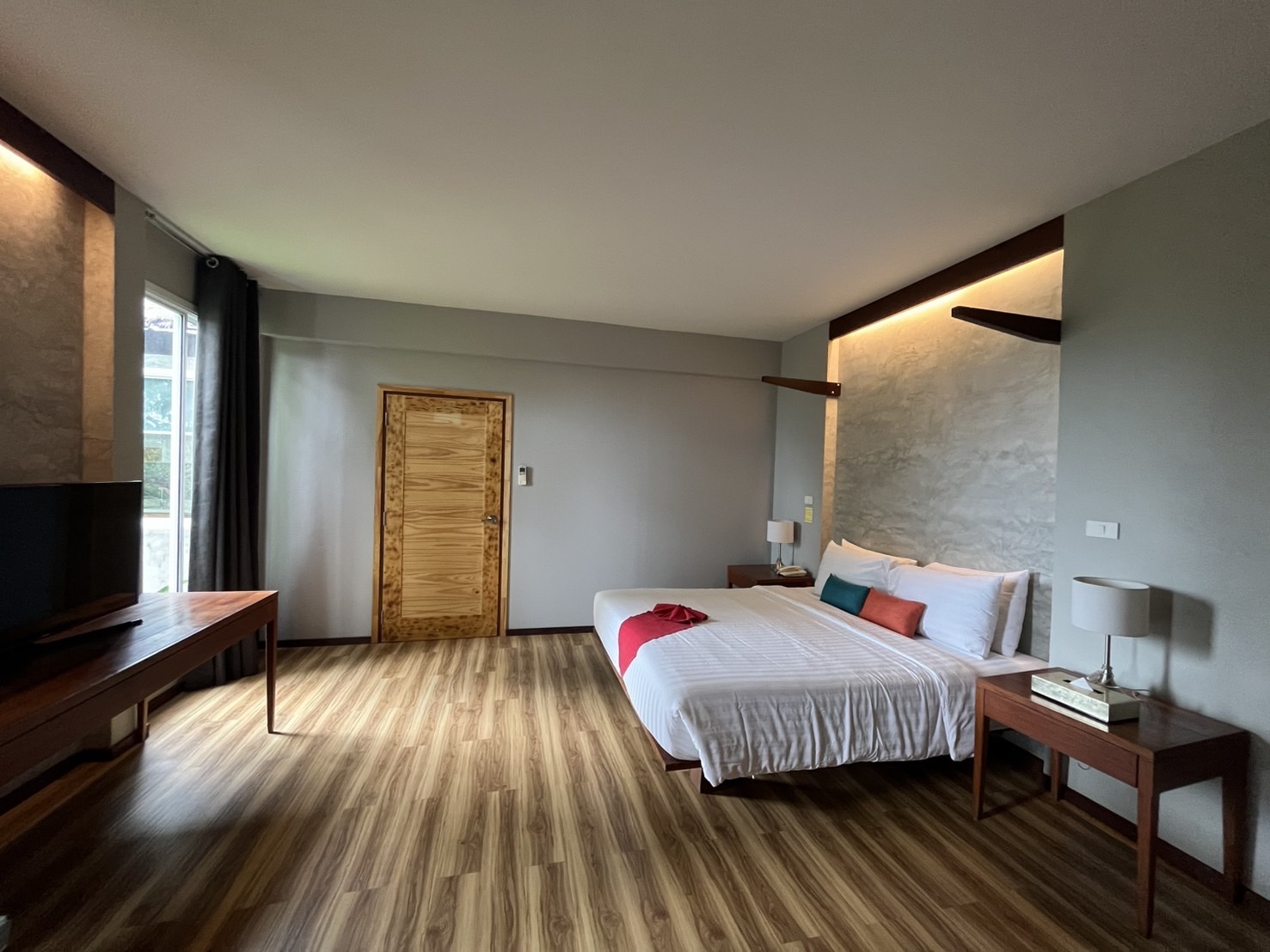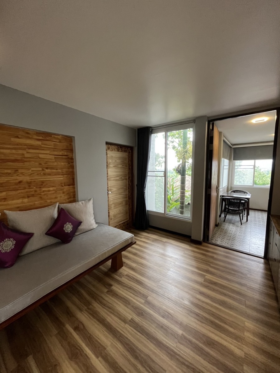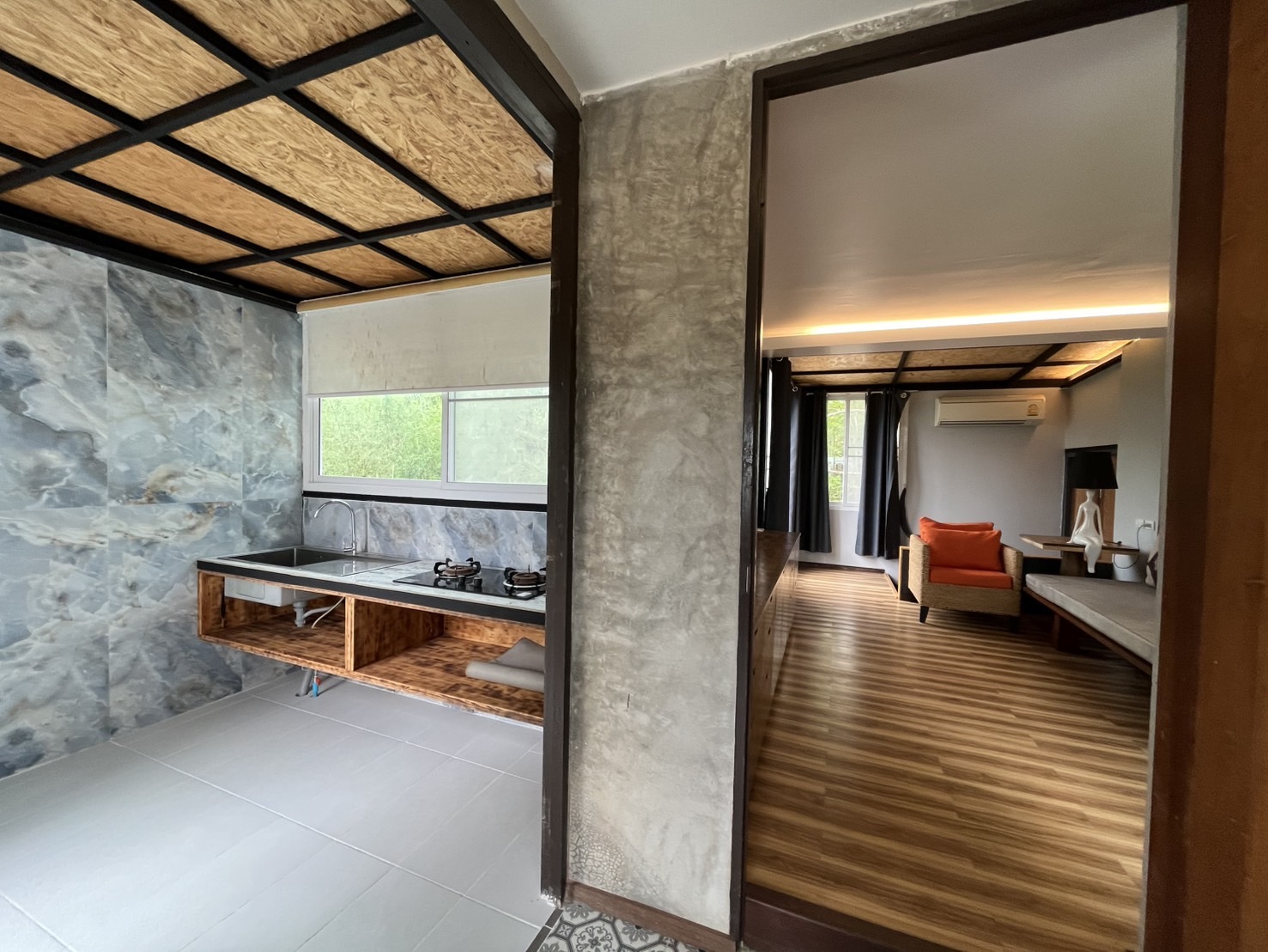 Villa Apartment (Mountain View) ขนาด 60 ตรม. ห้องนี้แบ่งโซนระหว่างห้องนอน, ห้องนั่งเลน ห้องครัว และสามารถประกอบอาหารได้ มีเตาแก๊สแบบ 2 หัวและถังแก๊ส สิ่งอ้านวยความสะดวกในห้อง ดังนี้