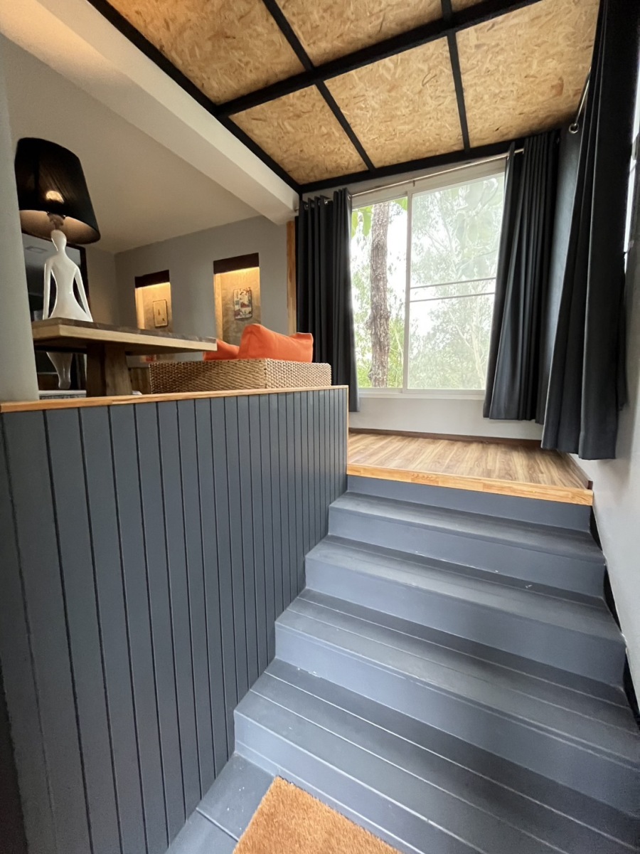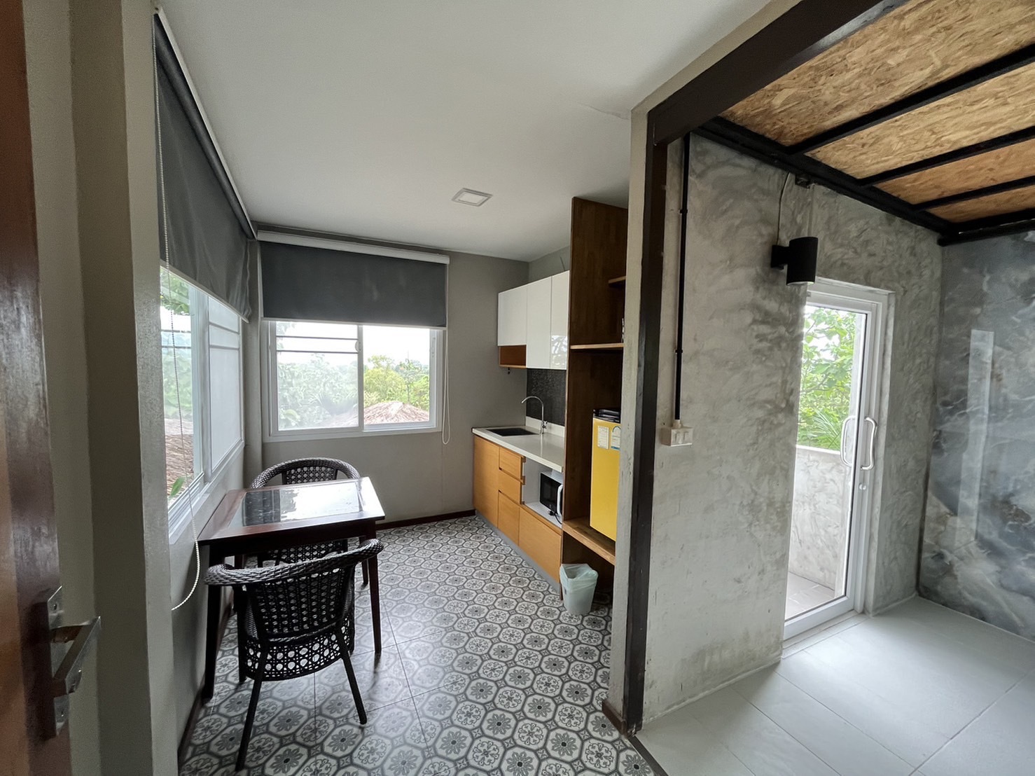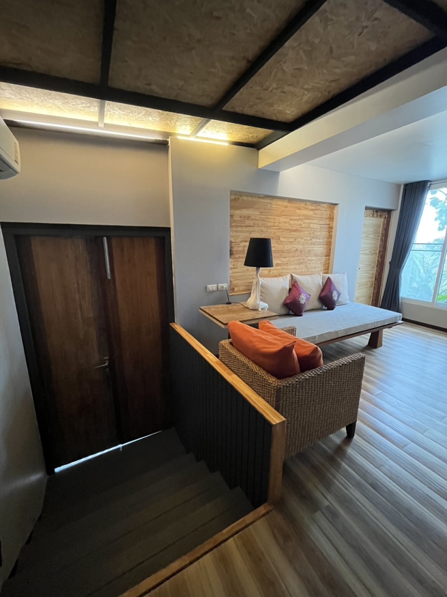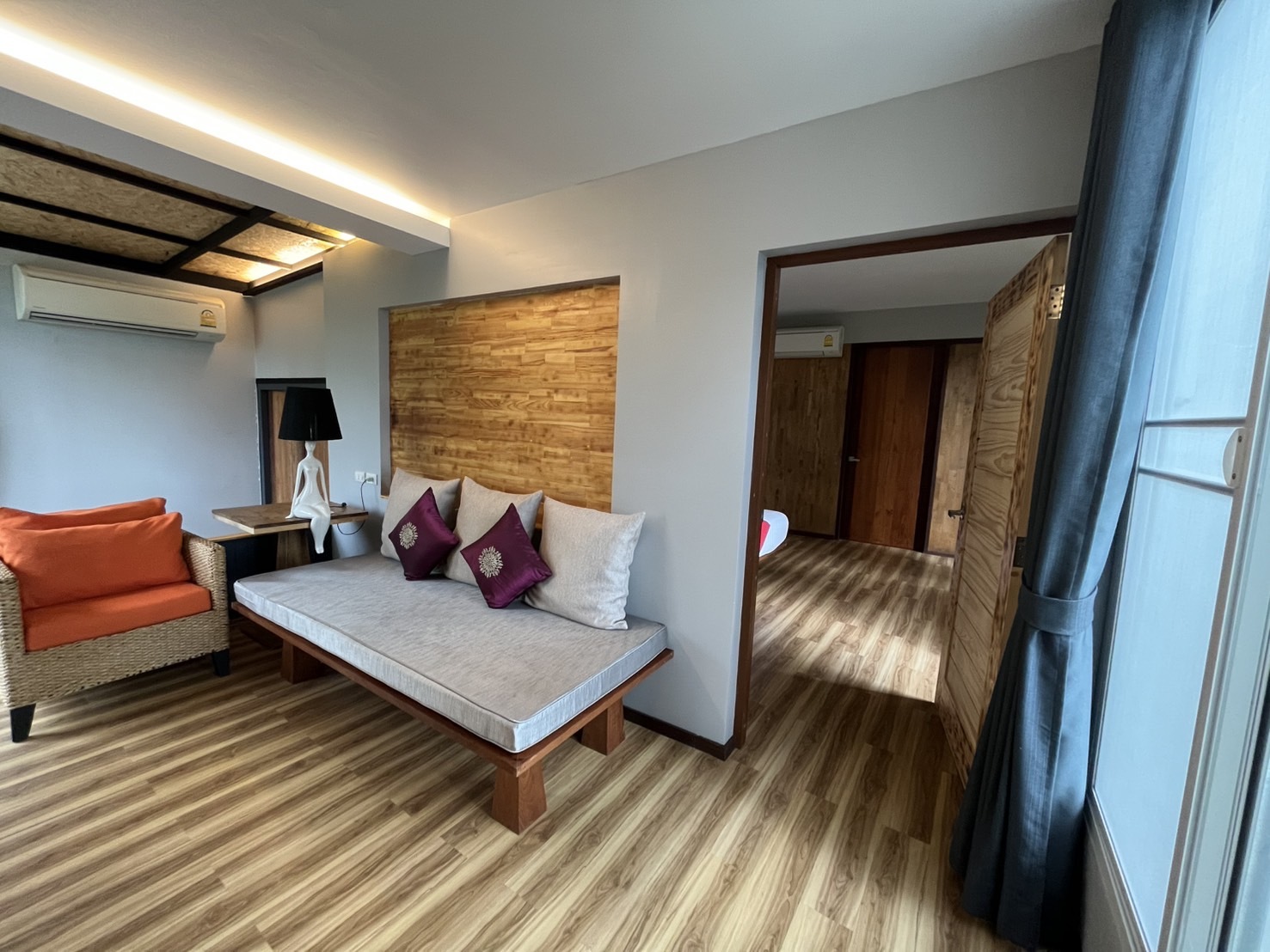 Villa Apartment (Mountain View) ขนาด 60 ตรม. ห้องนี้แบ่งโซนระหว่างห้องนอน, ห้องนั่งเลน ห้องครัว และสามารถประกอบอาหารได้ มีเตาแก๊สแบบ 2 หัวและถังแก๊ส สิ่งอ้านวยความสะดวกในห้อง ดังนี้